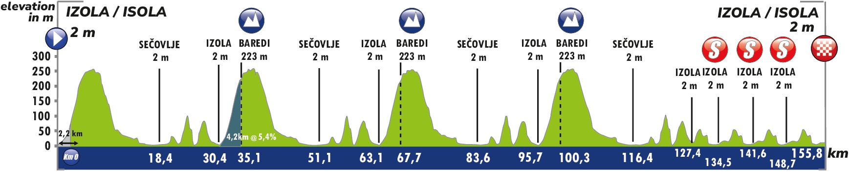 The start will take place at the Cankarjev drevored towards the shipyard. At the roundabout turn right onto the Prešernova road and at the next roundabout left on Kajuhova Street. The route runs along Kajuhova, followed by the ascent to Livade-Baredi-Gažon. At the intersection in Šmarje, turn right onto the state road. This road leads to Dragonja, where take turn to road 628 to the border crossing Sečovlje to connect to the 111th road. The route runs to the top of the ascent to Belvedere, where turn left for the descent from Jagodje to Izola. At the roundabout of Prešernova, Južna and Morova Street, turn left and then quick right along Morova street, on Dantejeva street and continue to Drevored 1. maja and to Cankarjev drevored to the finish line. The race will take three such laps. On the sketch marked with magenta.